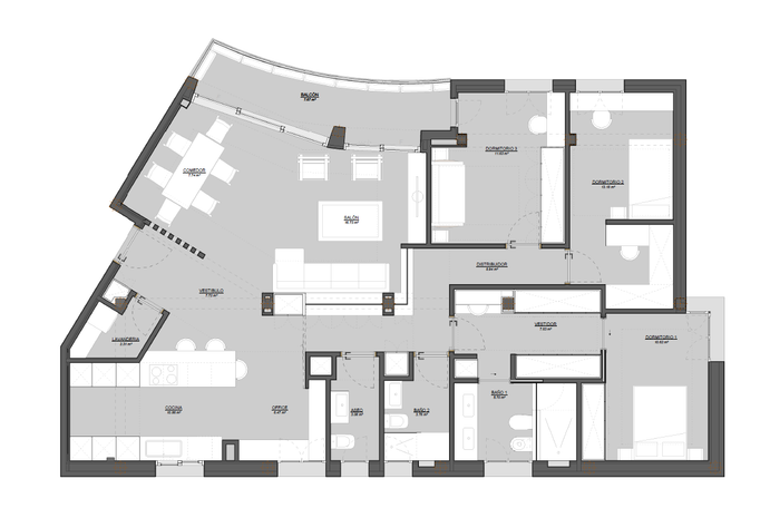 Ubicada en la séptima planta, esta vivienda de estilo clásico presenta una distribución diseñada para separar el área familiar del área de servicio. Sin embargo, su configuración original desperdicia una cantidad significativa de metros en pasillos, afectando la eficiencia espacial.