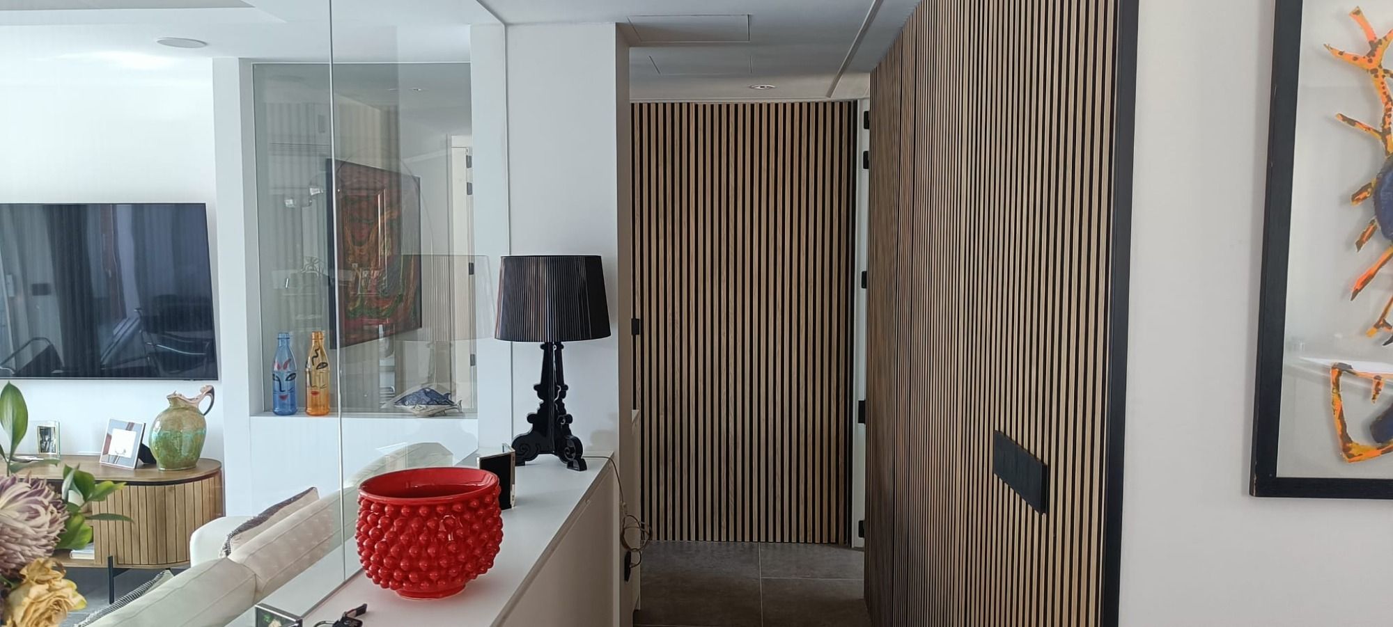 Para preservar la sensación de amplitud, se evita la segmentación con tabiques sólidos, optando por un mueble especial con medio cuerpo de vidrio, que genera una transición delicada entre el área pública y privada.