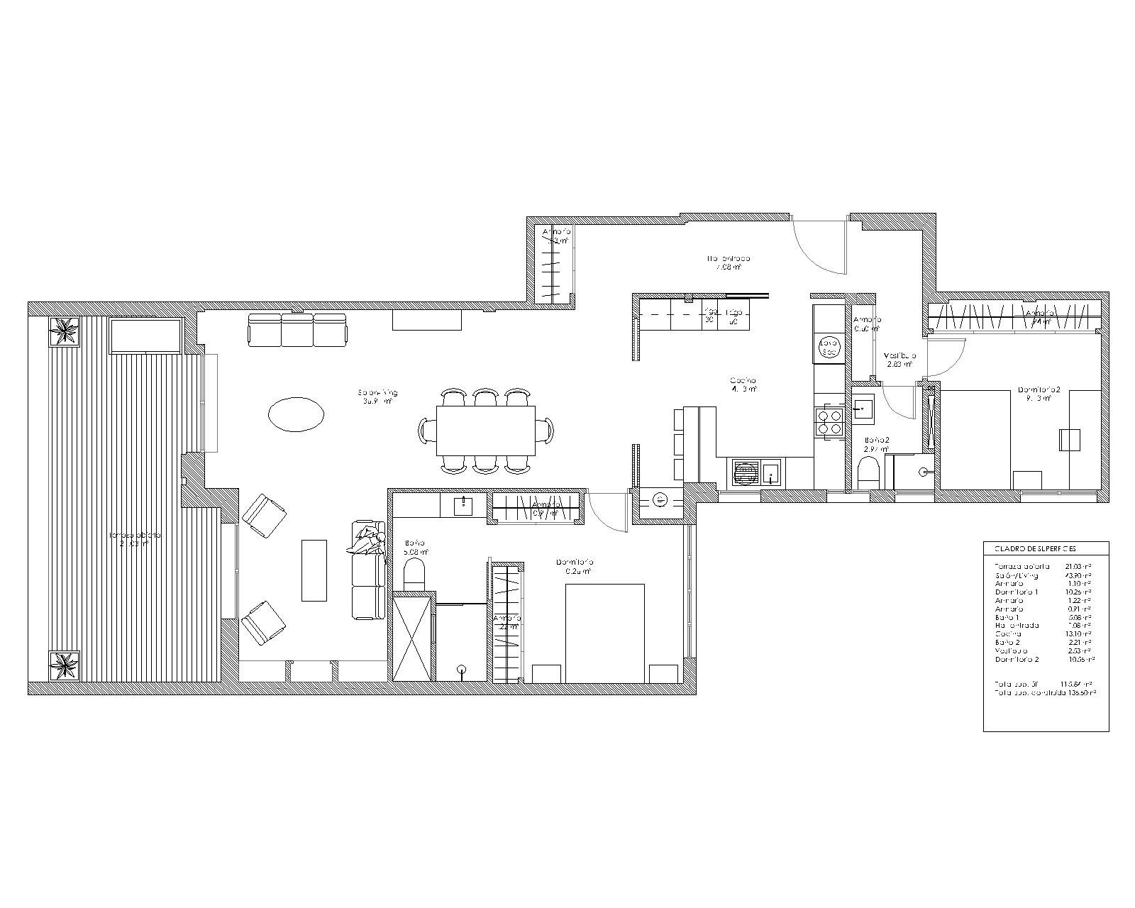 El proyecto busca modernizar la vivienda y optimizar sus espacios, ampliando la cocina y el segundo dormitorio, además de reorganizar la distribución de los baños para lograr una mayor funcionalidad. La reforma incorpora una paleta de materiales mas luminosa y contemporánea, mejorando la percepción espacial y aportando una mayor sensación de amplitud. La zona de día se reconfigura para conseguir una distribución mas fluida entre salón, comedor y cocina; como resultado obtenemos una vivienda mas actual, confortable y adaptada.