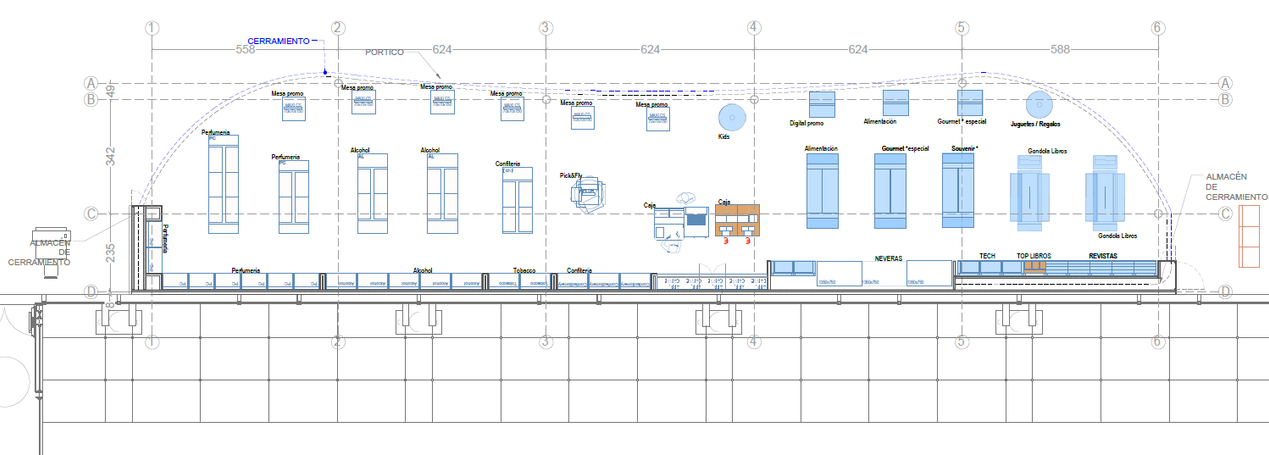 El establecimiento cuenta con una cuidada disposición de góndolas, mobiliario de pared y unidades refrigeradas, facilitando la exhibición de productos como libros, alimentos, bebidas, tabaco, souvenirs, perfumería y tecnología. Con instalaciones actualizadas y cumplimiento normativo, este espacio combina funcionalidad con un ambiente atractivo y acogedor.