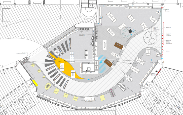 Esta renovación busca crear un espacio más eficiente y funcional. Se reorganizo el espacio, combinando elementos de mobiliario tanto nuevos como reutilizados. Además, se modificaron los suelos, combinando materiales pétreos y cerámicos enmarcados por tonos cobrizos, para lograr continuidad, armonía y un diseño distintivo. En la fachada, placas decorativas con la concha de Santiago aportan un toque característico que refuerza la identidad visual del espacio.
